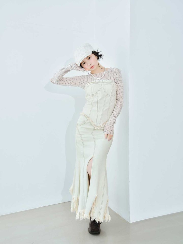 シアーなトップスでドット柄を大人っぽく取り入れながら、ホワイトデニムのセットアップでカジュアルなオンナ感を演出。トラッドなハンチングやラウンドスクエアシューズがこなれたスパイスに。