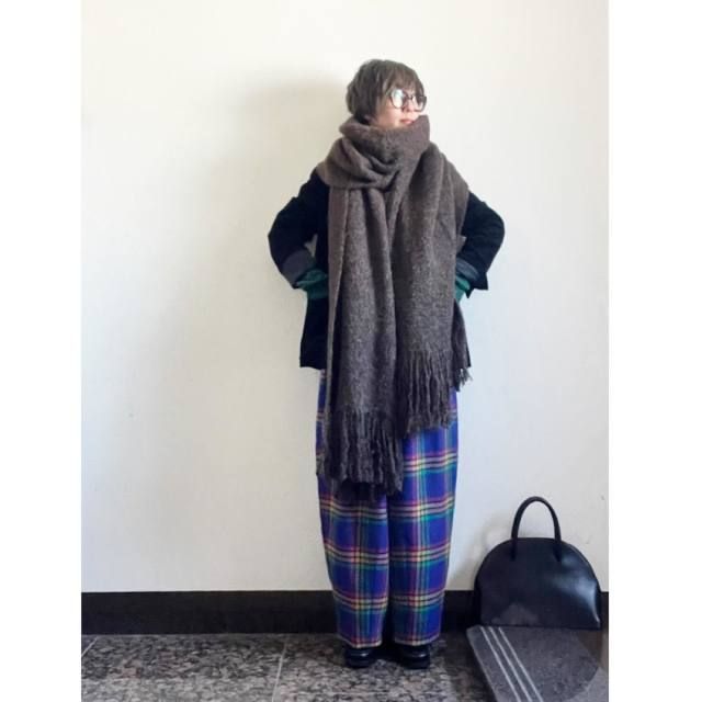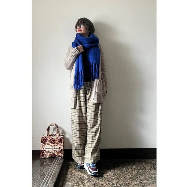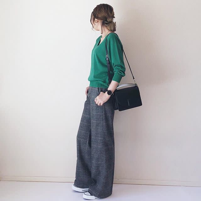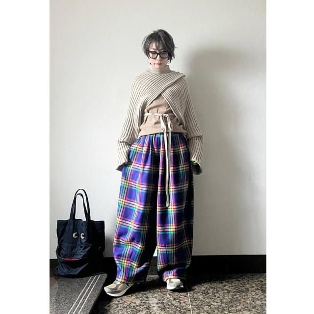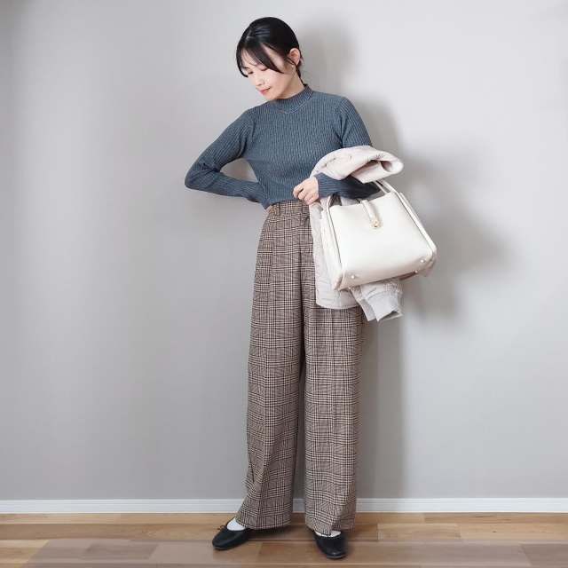 ワイドパンツというとのっぺりしがちですが、チェック柄で取り入れることで引き締まって見えるメリットもアリ。体型カバーしながら上品な装いに。