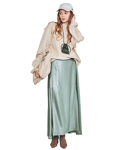 配色バランスに悩みがちなキレイ色スカートにもなじみやすいのがブラウンの魅力。黒や白よりパキッと色調の差がつきすぎず、それでいて引き締まった見た目に。サテンのつるっとした質感とメリハリがつく、しっとりマットなスエードレザーが引き立て役。