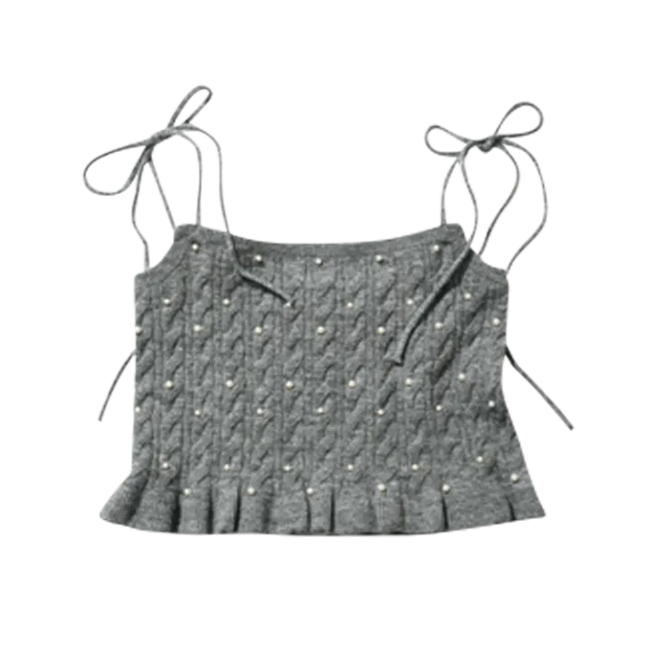 グレーにあわせてデニムも暗めなカラーをチョイス。一見シンプルに見えるけど、ビスチエのパールがさりげなく輝いてて可愛い♡