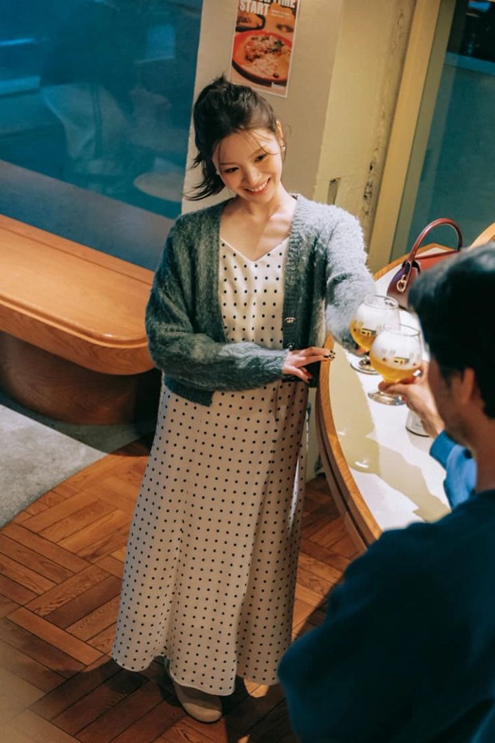 ニットカーディガン(ニットカーディガンとビスチエのセット)は着回し。ドット柄キャミワンピース 14,300円/Ungrid イヤリング 2,200円/アネモネ(サンポークリエイト)ハンドルバッグ 10,900円、ロングブーツ 14,900円/ともにチャールズ&キース(チャールズ&キース ジャパン)