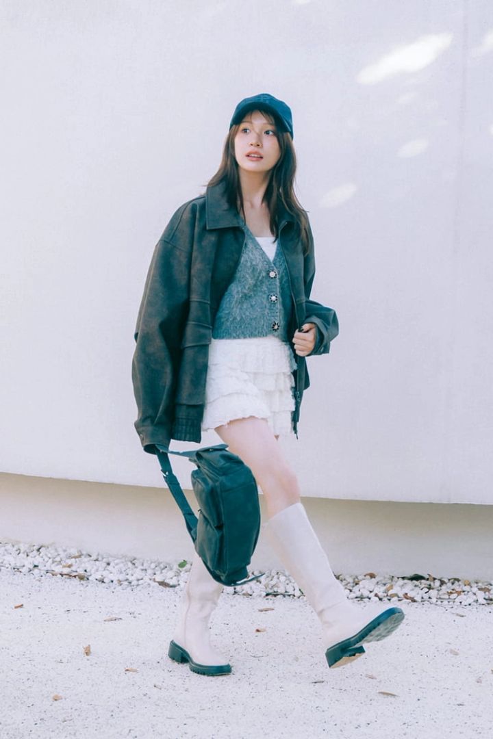 ニットカーディガン(ニットカーディガンとビスチエのセット)は着回し。レザーブルゾン 6,599円/WEGO  ティアードミニスカート 9,640円/CRANK(HANA SHOWROOM)キャップ 9,900円/OVERRIDE(OVERRIDE 神宮前)バッグ 3,629円/WEGO ロングブーツ 19,910円/RANDA インナー/スタイリスト私物