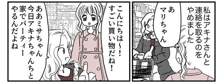 アキナさんがよくわからないことを言うので、もう連絡を取るのをやめました。それからしばらくして、スーパーで買い物をしているとママ友のマリちゃんに会いました。今日はアキナさんたちとパーティーをするそうです。マリちゃんのところは3人きょうだいなので、忠告してあげました。