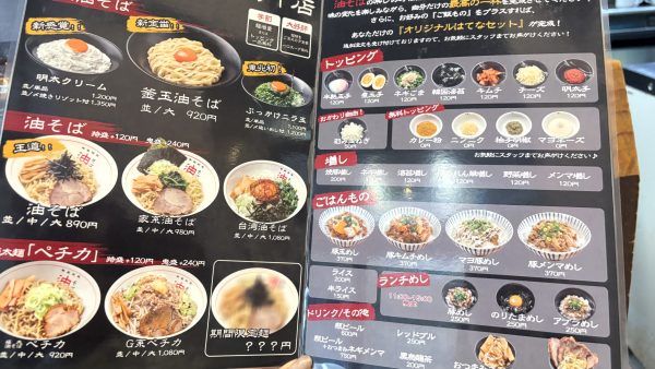 今回おじゃましたときのメニューは、こちらでした! 定番の油そばの他にも、アレンジされた油そばがたくさん。期間限定麺もあるそうで、これだけメニューがあると何度も足を運びたくなりますね。