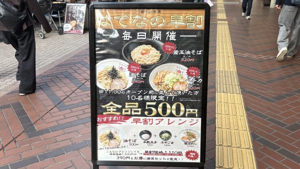 お店の前には魅力的な立て看板もありました。「はてなの早割」というサービスがあるらしく、オープン時間の11時に並んだ方は、全品500円で食べられるそうです! ワンコインで食べられるラーメンは、このご時世ありがたいですね。