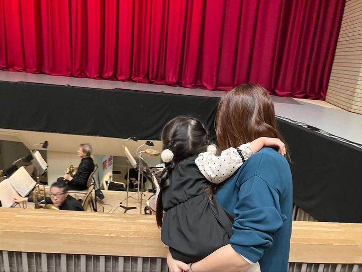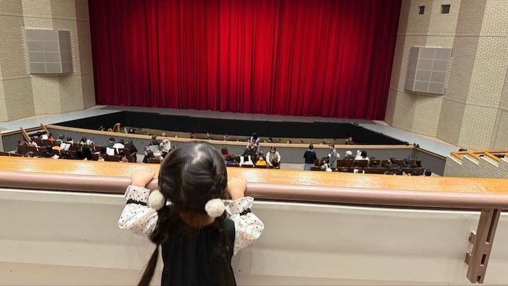 「バイオリンだー!」と言いながらオーケストラを見る娘。母もワクワクです