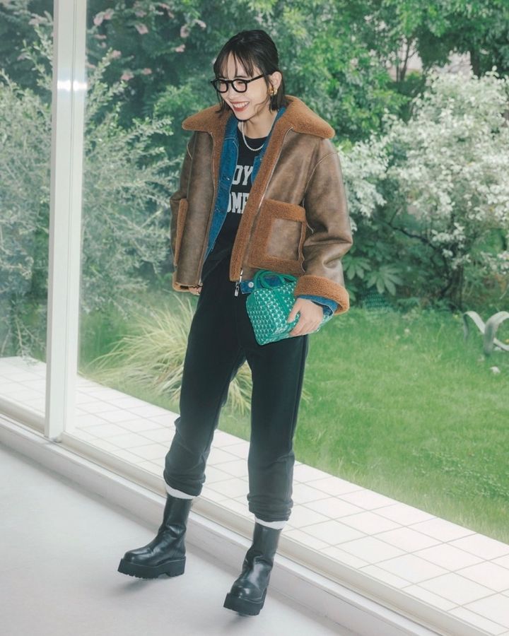 フェイクムートンコート¥61,600(ジャッキー/ジャック・オブ・オール・トレーズ プレスルーム) デニムジャケット¥20,900(アルページュストーリー プレスルーム) ロングスリーブTシャツ¥14,300(ウィム ガゼット/ウィム ガゼット ルミネ新宿店) スウェットパンツ¥25,300(ロンハーマン/ロンハーマン)眼鏡¥46,200(アイヴァン/アイヴァン 東京ギャラリー) ソックス¥1,474(ユナイテッドアスレ/キャブ) ネックレス¥22,000〈ジゼルベー〉 ピアス¥15,840〈ケネス・ジェイ・レーン〉 リング¥25,630〈フル・オブ・グレイス〉(すべてZUTTOHOLIC) ブーツ¥39,600(カミナンド/ヴェルメイユ パー イエナ 日本橋店) バッグ¥272,800(モワナ/モワナ 伊勢丹新宿店)