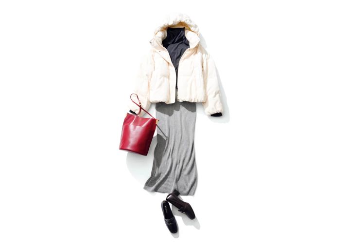 ダウンやパデッドなどスポーティなアウターの日は、女性らしさを意識したラインの出るスカートでお出かけ。冬の白はそれだけで可愛いから、グレーやシルバーと合わせるだけでグッとくるコーデに。