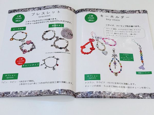 「Sally Mart」の制作体験は、完成イメージを決めるところから始まるのが特徴です。 最初に案内されたのは、制作アイテムが掲載されたカタログ。選べるアイテムは「ブレスレット」や「キーホルダー」、「ビーズベルト」、「ペット首輪」など、バリエーション豊富です。