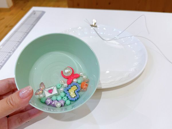 サイズが決まったら、いよいよパーツ選びです。ずらりと並ぶビーズやチャームを前に、色や形、全体のバランスを思い浮かべながら組み合わせを考えていきます。 パーツは、カラフルなものからシックなものやパール系まで幅広く揃っています。