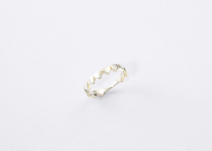 小さなハートが連なるエタニティリング。繊細なシルバーがリズミカルに光を反射し、指先にフェミニンな輝きを添えます。華奢なデザインは単品でも重ねづけでも自然に馴染み、控えめながら存在感のあるアクセントに。