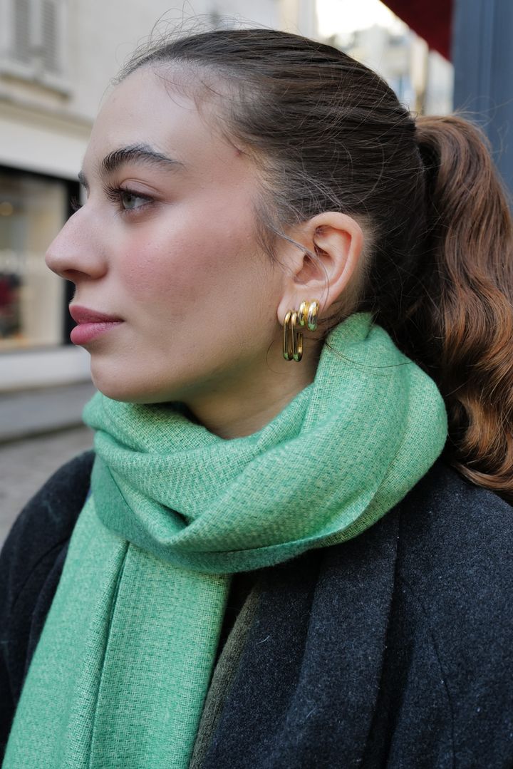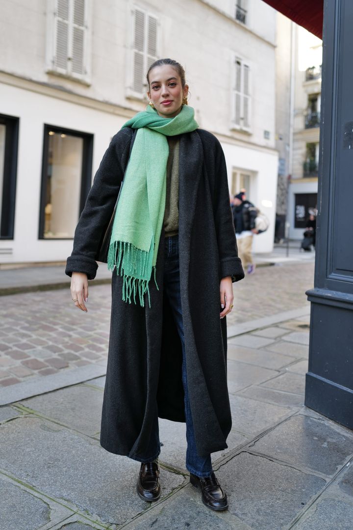 チャコールグレーのロングコートやインディゴカラーのデニム、ローファーなど、ベーシックアイテムで作る冬コーデがサブリーヌの定番。この日は、ダークトーンにエレガントに映える、エメラルドグリーンのマフラーを主役にコーディネート。