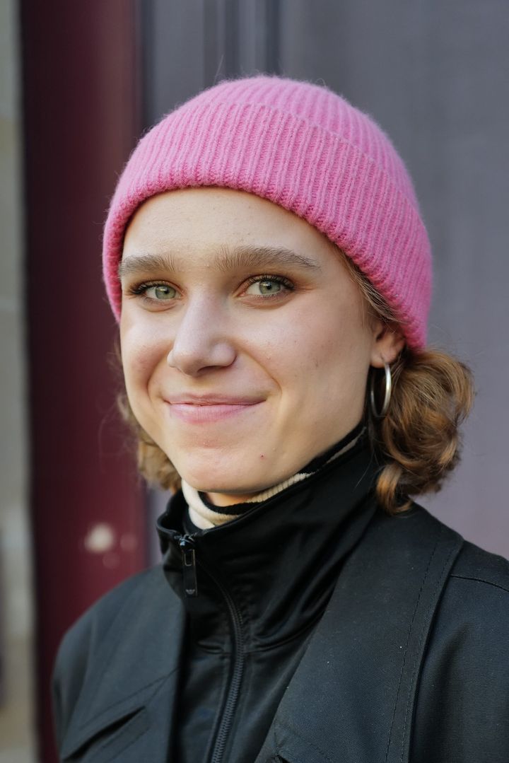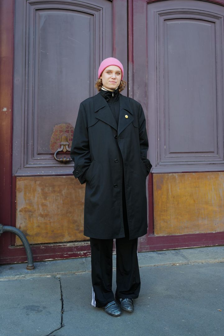 パリジェンヌらしいヴィンテージアイテムでのコーデを披露したパウラ。ブルゾンやトラックパンツを重ねたクールな黒コーデに、バブルガムピンクのニット帽がひときわ映えて。