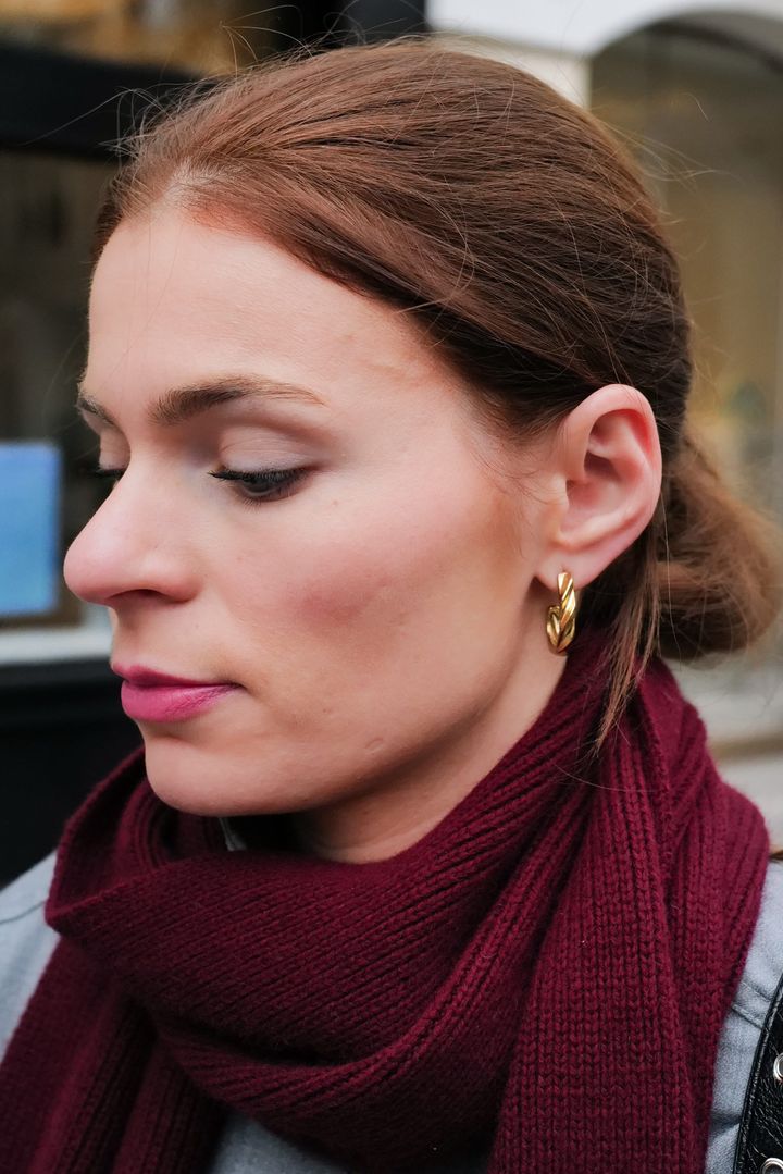 マフラーコーデの日は、ポニーテールで首元をすっきりと出して。ボリューム感のあるピアスのレイヤードで横顔を印象的に。