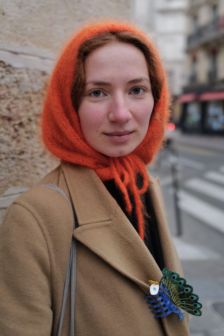 オレンジカラーのフードマフラー、コートにあしらったクジャクのヘアアクセサリー。まるで童話のような世界観を感じる、シビルの小物使いがチャーミング。