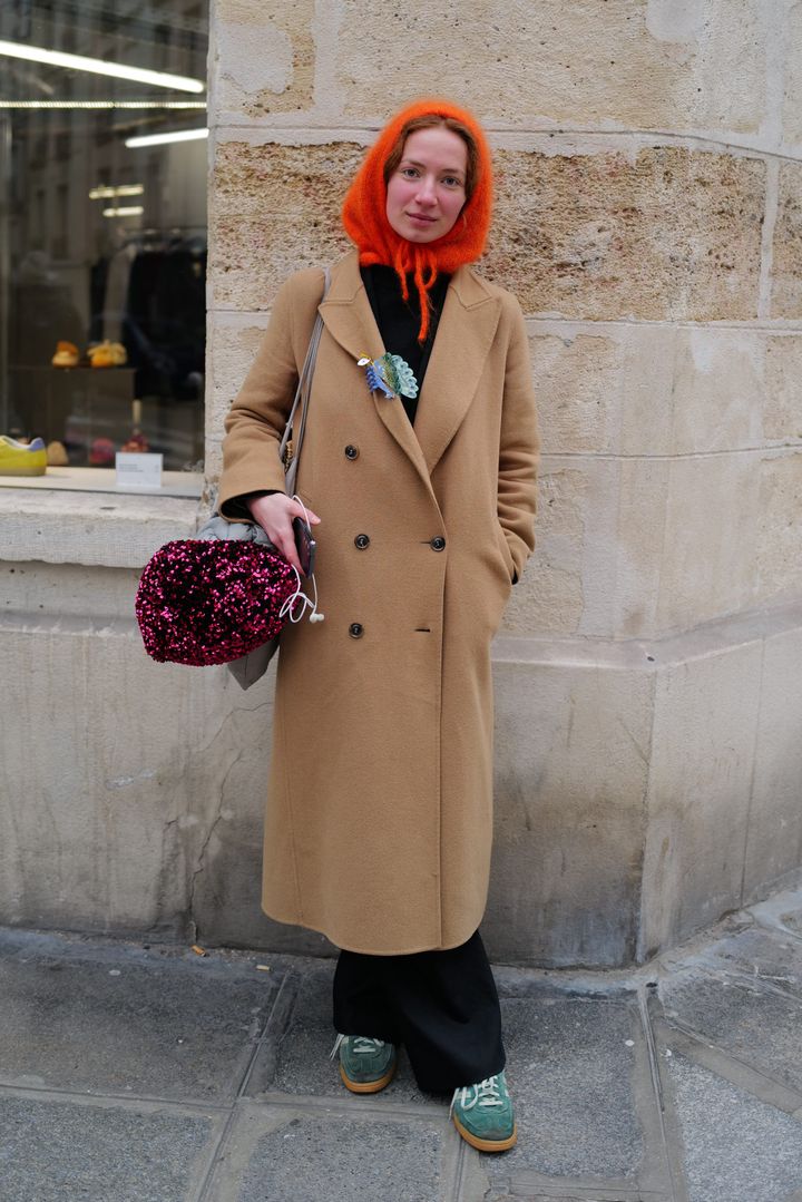 シンプルコーデ+遊び心のある小物使いがシビルのファッション・セオリー。この日は、シックなコートコーデに、オレンジカラーのフードマフラーやスパンコールバッグなど、とびきりプレイフルな小物をちりばめて、自分らしい着こなしを楽しんでいた。