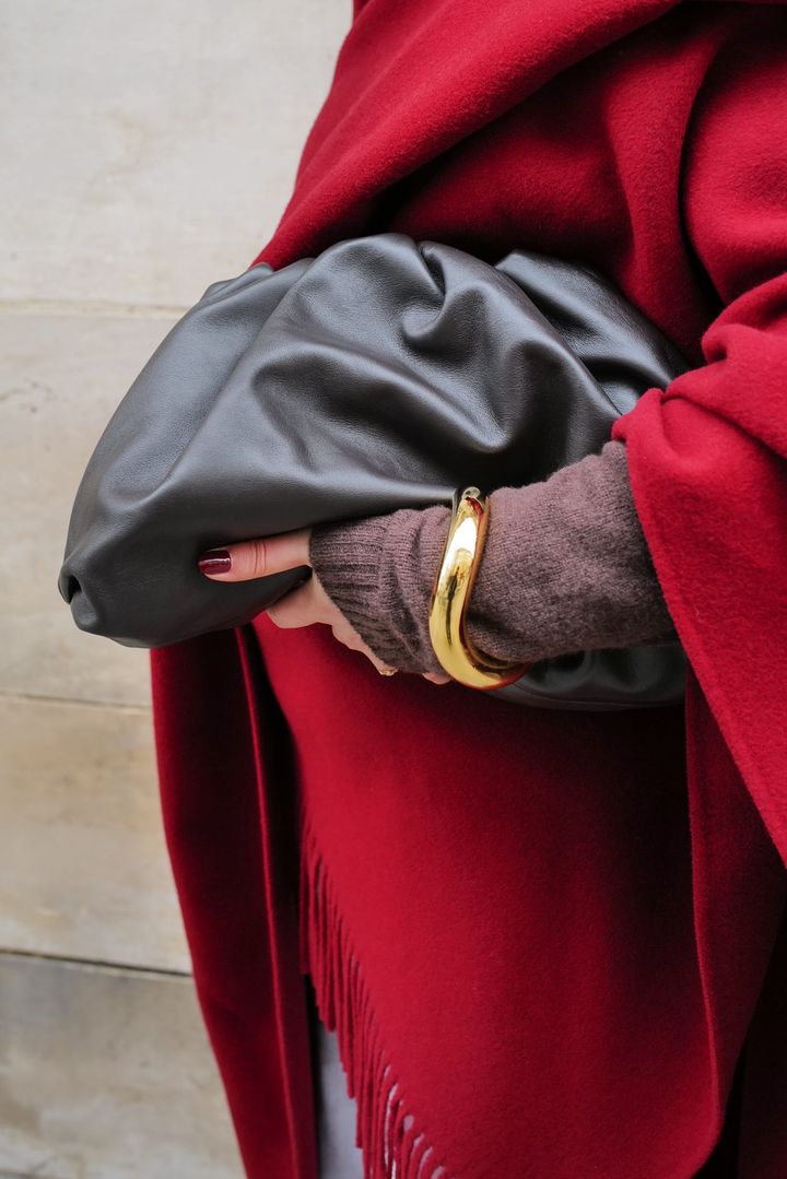 「ボッテガ・ヴェネタ」のクラッチバッグや「シャネル」のビッグフレームサングラスなど、モードな小物で彩るクロエのモノトーンコーデ。真っ赤な大判ストールをあしらうことで、一気にドラマチックにチェンジ。