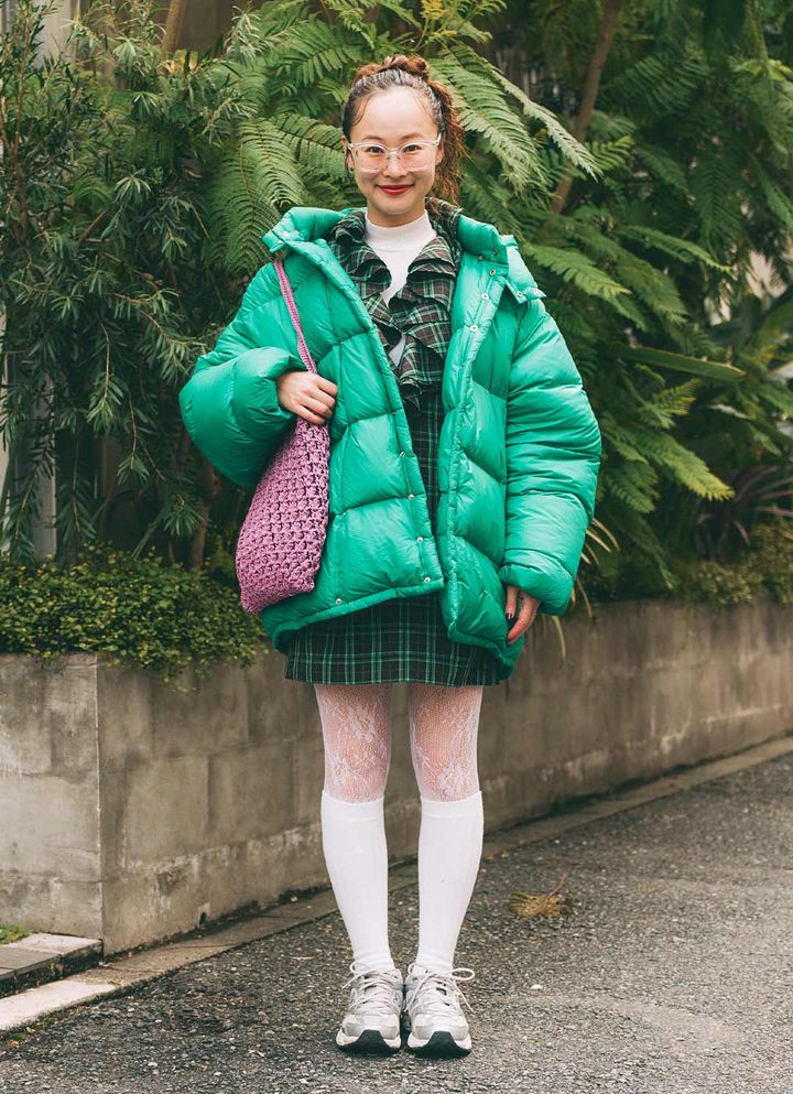 Instagram:@pledica_chiemi爽やかでレトロなグリーンチェックのミニワンピースに、グリーンのダウンジャケットを重ねてまとまりのある着こなし。足元は、白のレースタイツに白ソックスをレイヤードしてオリジナリティをプラス。上半身にボリュームがあるぶん、足元はタイトにスッキリとまとめることでバランスのよい着こなしが完成。item▼