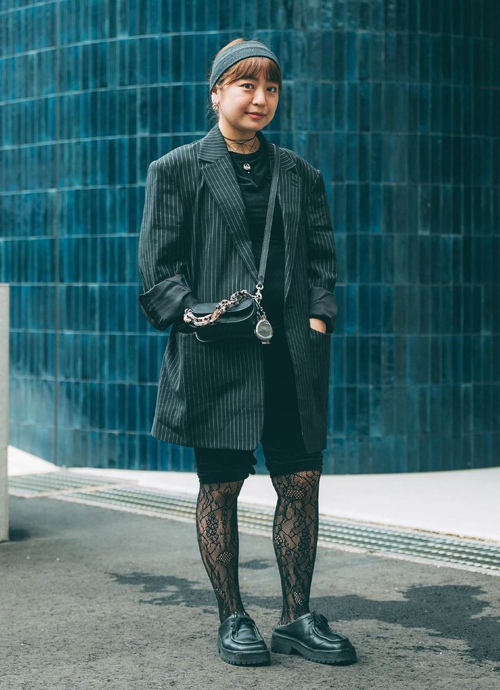 Instagram:@mio_nagai68ショート丈のオールインワンに、オーバーサイズのジャケットを重ねて。ジャケットとインナーの丈感を揃えることで、自然とバランスのよいスタイリングが完成。足元は繊細な黒レースのタイツで、ほんのりドレッシーなムードをのせつつ、レザーシューズでキリッと辛口エッセンスも添えた甘辛ミックススタイル。item▼