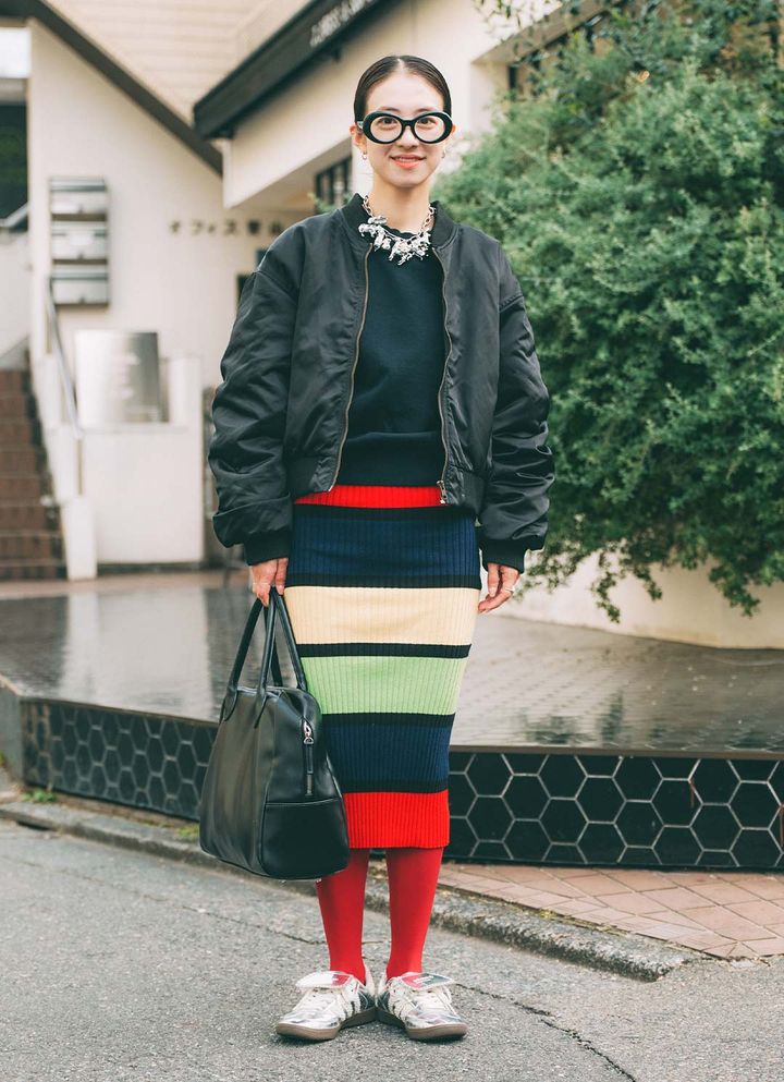 Instagram:@hotat__e『ジウジウ』のストライプニットスカートを主役に、黒のブルゾンで全体をバランスよく引き締めたミユさん。深みのある赤タイツを挿し色にすることで、コーデが一気にこなれた印象に。足元は『アディダス×ウェールズ・ボナー』のコラボスニーカーを合わせて、周りと差がつくエッジィで都会的なスタイルに。item▼