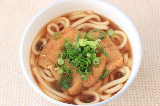 いなり揚げができたら、次はうどん。鍋に無限つゆ、水、塩を入れて加熱し、うどんを加えて温めれば出来上がりだ。器に盛り、最後にいなり揚げとねぎを散らす。