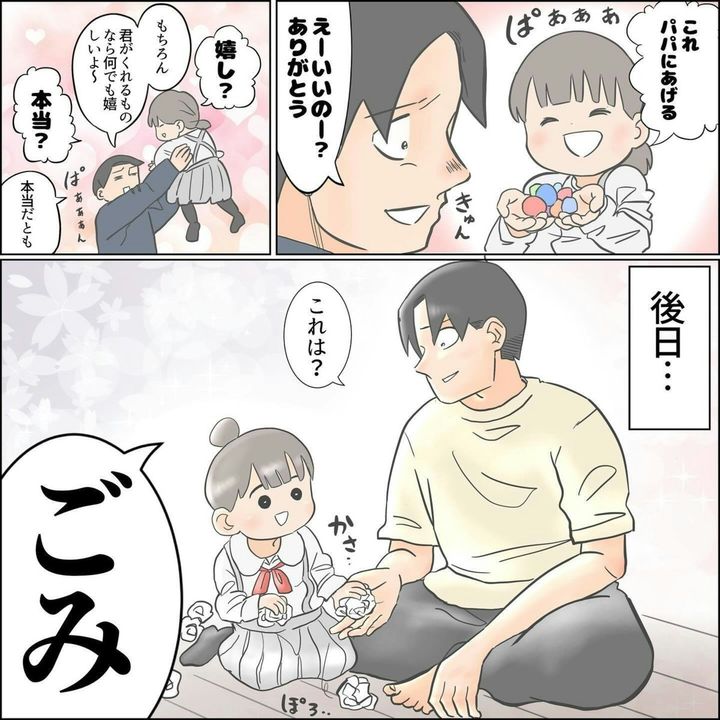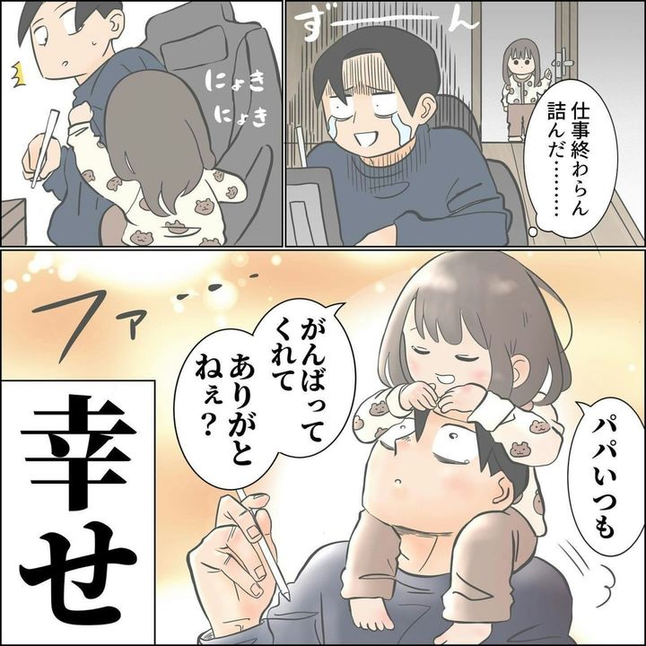 どんなに疲れていても、娘に「ありがとう」と言われればうれしいもの。娘がこんなことを言ってくれるなんて、ゆーぱぱさんが幸せなのがとても伝わってきます。そして、そんな娘の予想外のひとことに、思わず「かわいすぎる!」と言いたくなりますよね。