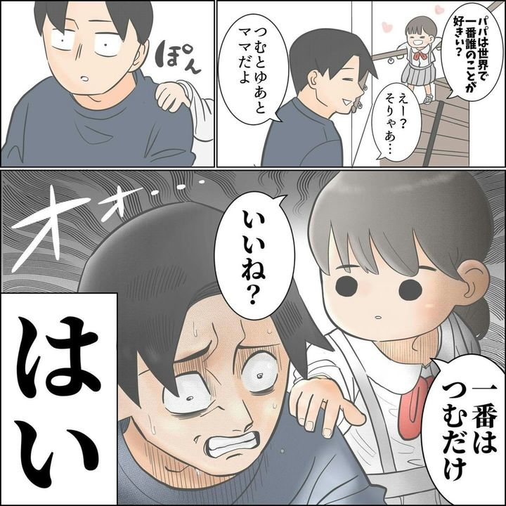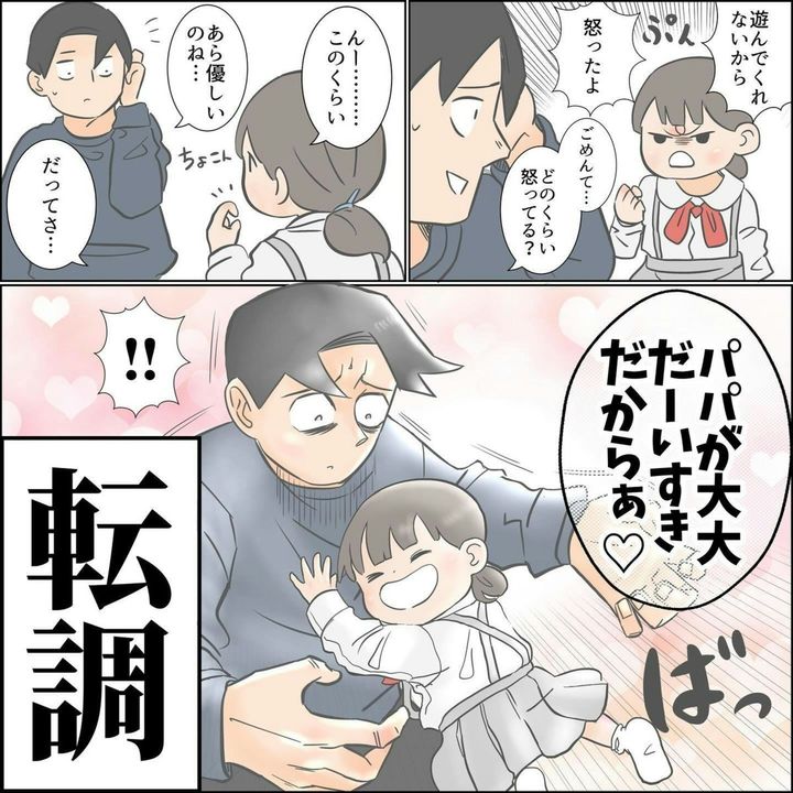 ゆーぱぱ(@yuupapa.ikuji04)さんの娘のかわいすぎる姿を漫画で紹介します。仕事で疲れていると「がんばってくれていつもありがとう」と言ってくれる娘のつむちゃんにパパはメロメロ。あるとき、怒っていたはずのつむちゃん。しかし、その後パパが悶絶するひとことを炸裂させ、ゆーぱぱさんを翻弄します。そんな娘と過ごす日常は、パパにとって幸せの連続なのです。