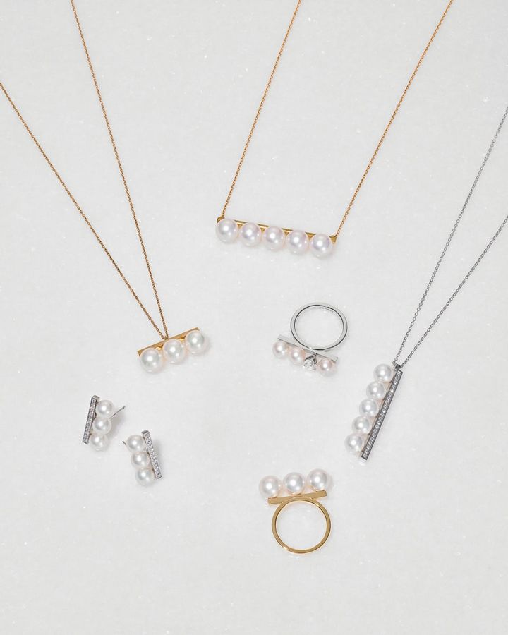 中央上から 時計回りに:ネックレス〈バランス シグネチャー〉[YG×あこや真珠]¥820,600、リング〈バランス ダイヤモンド ソロ〉[WG×DIA×あこや真珠]¥1,551,000、ネックレス〈バランス プラス ダイヤモンド パヴェ〉[WG×DIA×あこや真珠]¥1,034,000、リング〈バランス ネオ〉[YG×あこや真珠]¥465,300、ピアス〈バランス ネオ ダイヤモンド パヴェ〉[WG×DIA×あこや真珠]¥891,000、ネックレス〈バランス ネオ〉[YG×あこや真珠]¥430,100(全てタサキ)
