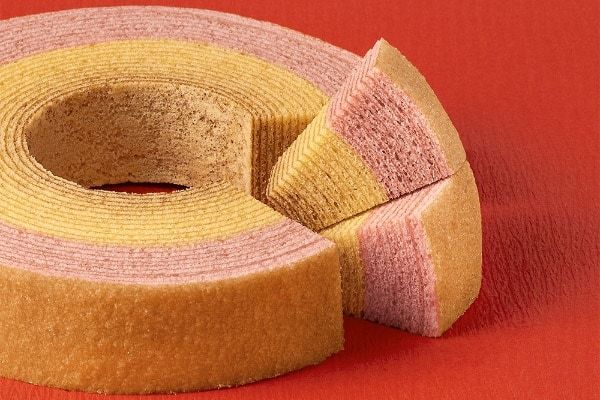 外側は国産桜葉を練り込んだ桜色のバームクーヘン、内側はたっぷりの卵を贅沢に使った定番のバームクーヘンとなっています。
