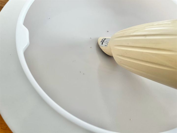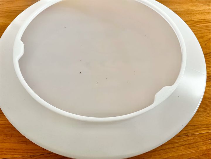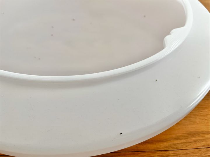 まずは、リビングのシーリングライトから取り掛かりましょう。このライトは、一年間使用しています。リビングを明るく照らしてくれる頼れる存在ですが、シェードを外してみると…ぎゃ〜!内側には小さな虫の姿が…!