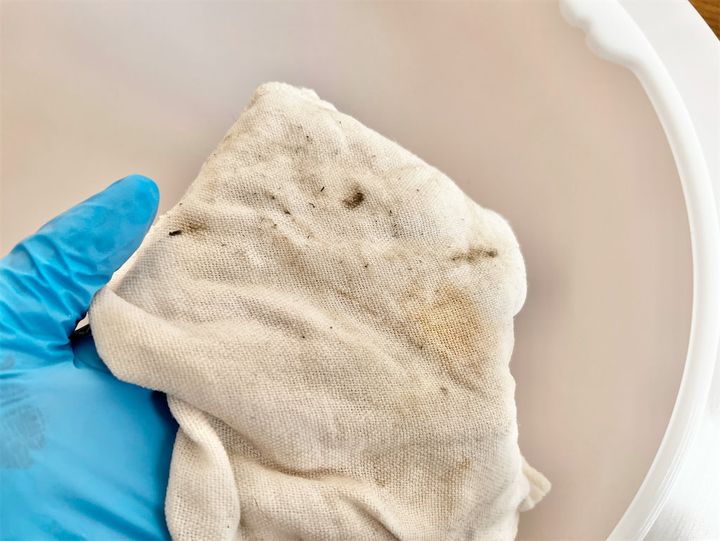 次に、バケツにぬるま湯を2L用意し、オキシクリーンを付属のスプーン1/2杯分投入します。この溶液をクロスにしっかり含ませ、シェード全体を拭いていきましょう。