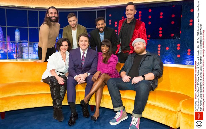 2019年に撮影された写真。英国の人気テレビ番組『ザ・ジョナサン・ロス・ショウ』にて。上段左から、『クィア・アイ』でおなじみジョナサン・ヴァン・ネス、いまは亡きリアム・ペイン、ニッシュ・クマール、有名ダンサーのクレイグ・レヴェル・ホーウッド。 Brian J Ritchie/Hotsauce/Shutterstock / Aflo