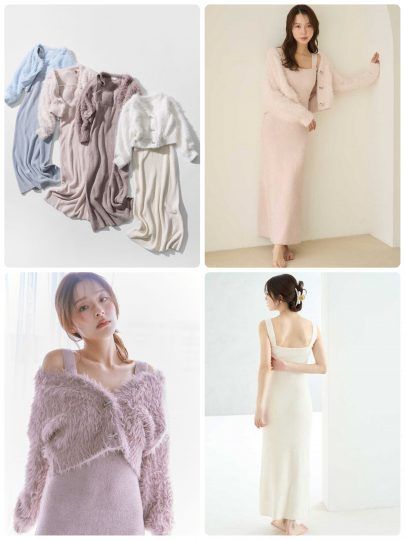 毛足の長いシャギーカーディガンとニットワンピースをセットに。