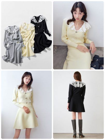ニットは花柄レースのラッフルカラーといびつボタンがポイントで、スカートは長めのミニ丈なので大人女性にも◎