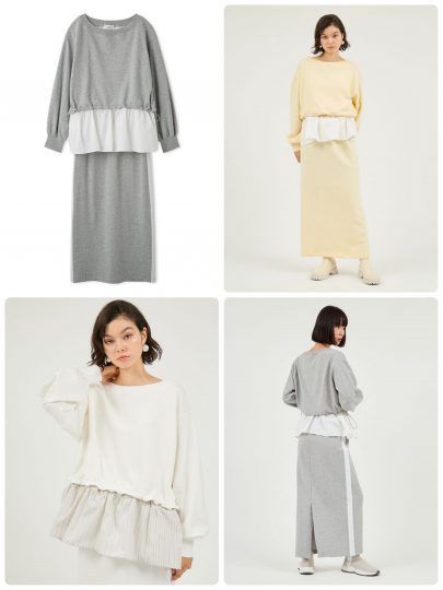 トップスの裾には布帛生地をドッキングし、1枚でレイヤードしているようなおしゃれさ。襟元が大きく開いているため、ワンショルダー風に着こなすこともでき、タートルネックなどをレイヤードするのもオススメです。スカートは体のラインを拾いにくいIラインシルエットで、サイドにはライン入り。足長効果を演出してくれます。
