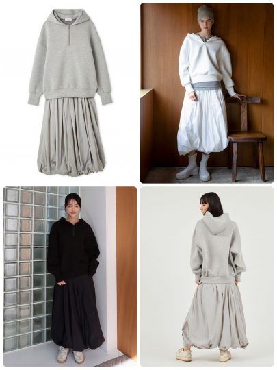 もっちりハリ感のあるダンボール素材のフーディーとナイロン素材のバルーンスカートをセットに。