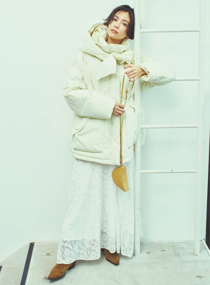 ミドルダウンコート¥39,600、レーススカート¥19,800(共にメゾンスペシャル/メゾンスペシャル 青山店)、ブーツ¥22,000(ル タロン/ル タロン有楽町マルイ店)、バッグチャーム¥18,700(パフト/アダム エ ロペ)