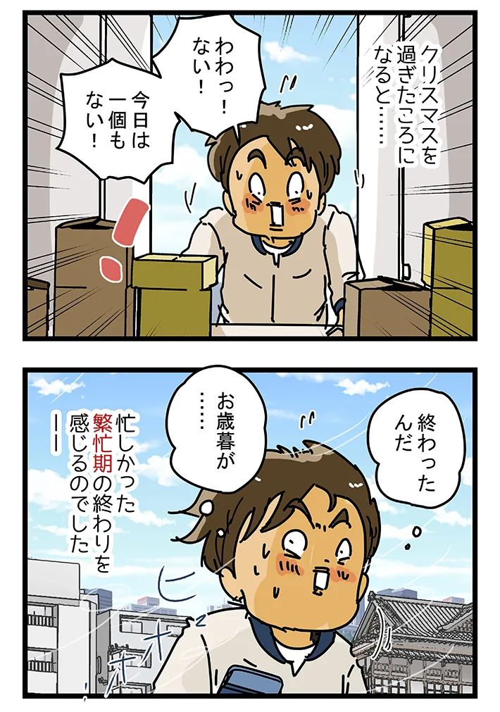 クリスマスが過ぎた頃、そんなお歳暮をさばき切ったコータローは、やっと繁忙期の終わりを実感するのでした…。