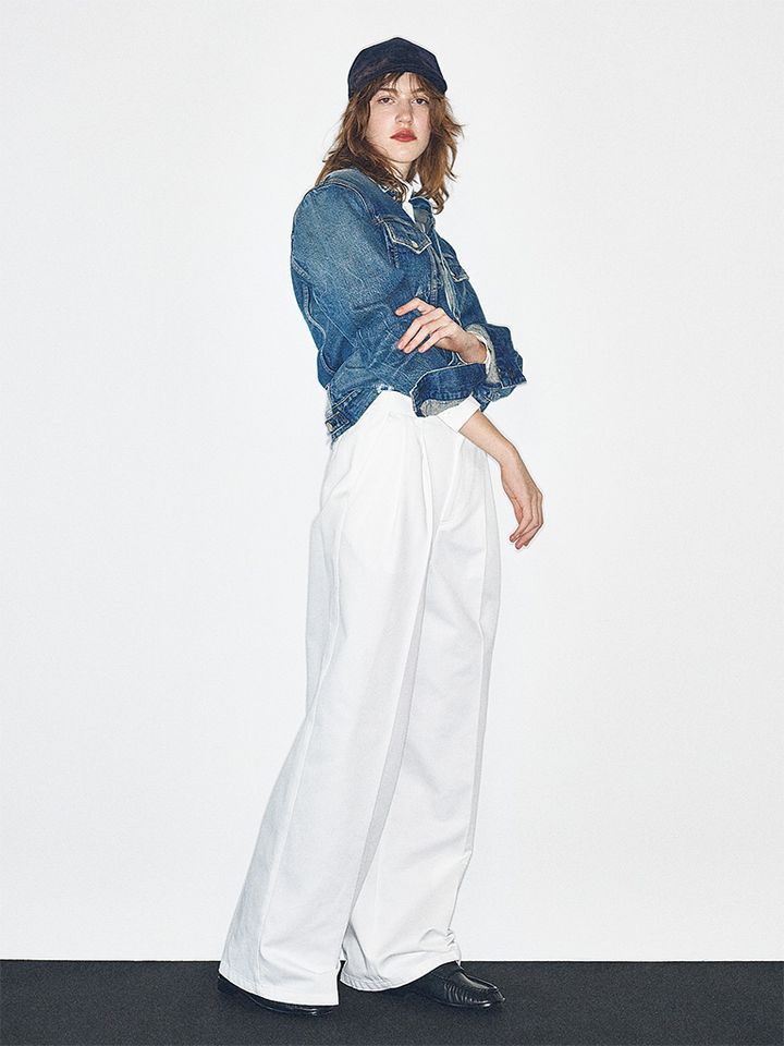 シューズにたっぷりとかかるほど重厚感のある太めのすそが、力の抜けた雰囲気をかもし白パンツの緊張を払拭。しっかりと硬さのある綿混素材で、ルーズながら端正さはキープ。ハリのある質感には、ウエストやヒップまわりのアタリを拾わない利点も。