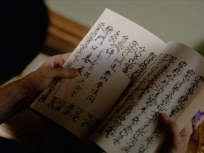 近松門左衛門の著書『天網島』に挟まれた千切れた通行切手。この通行切手は瀬川が吉原を出られるように、重三郎が用意したものでした。切り取られた上の部分は瀬川がお守りのように大切に持っていると思っています。