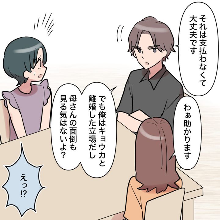 するとナオキさんは「それは支払わなくて大丈夫です」と二つ返事で承諾してくれました。私は「わぁ助かります」と素直にお礼を伝えます。しかし次の瞬間、ナオキさんはキョウカさんへ視線を移すと、「でも俺はキョウカと離婚した立場だし、母さんの面倒を見るつもりもないよ?」と冷ややかに言い放ちました。