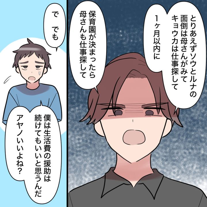 ナオキさんは、キョウカさんには「1か月以内に仕事と保育園を探すこと」、義母には「キョウカさんが求職中の間は子どもたちの面倒を見ること」、さらに「保育園が決まったら仕事を探すこと」を指示しました。これで正真正銘、キョウカさんたちの援助をしなくてよくなる!心の中で喜んでいると、トモヤが「で、でも、僕は生活費の援助は続けてもいいと思うんだ、アヤノいいよね?」と言い出しました。