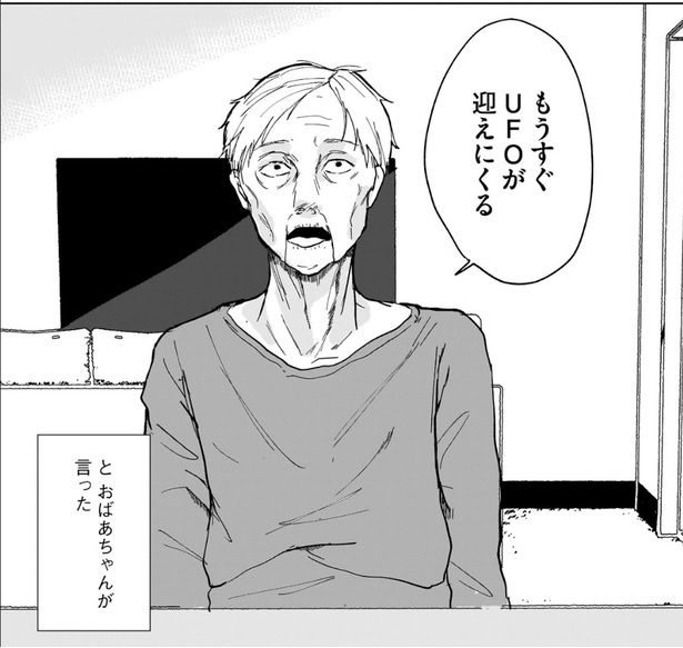 認知症が進行した祖母と、その介護を担う家族。自分のこともわからなくなり、奇妙な言動ばかりの祖母は、ある日「もうすぐUFOが迎えに来る」と語りだす。その突飛な言葉は、家族にとって特に大きな意味を持たず、いつものこととして無視されるが――。タイトルからも推測できる通り「姥捨山」を、日常と非日常のボーダーともいえるSF的な空気の中でアップデートした作品だ。