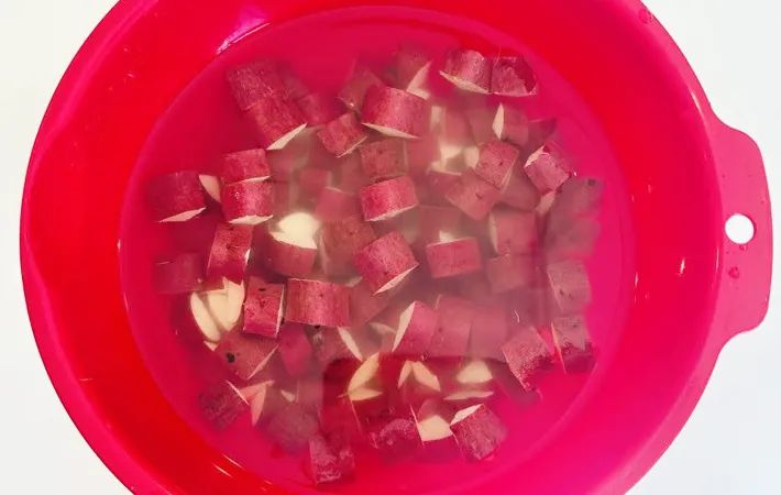 さっと水にさらしておくとアク抜きと変色防止になります。