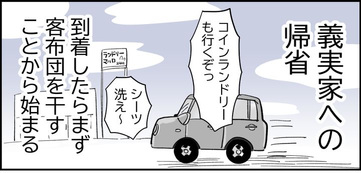「自分たちのものは自分たちで用意してね」というのが義母のモットー。まず、到着したら客布団を干し、コインランドリーへ行ってシーツなどを洗濯→乾燥から始まります。また、義実家のルールとしてお風呂はシャワーだけです。人数も多いので毎日近所にあるスーパー銭湯に行きます。
