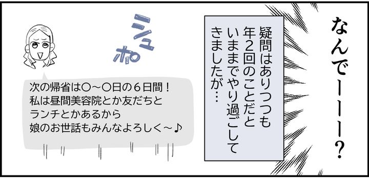ミナちゃんは、私たちに帰省の日を合わせてもらって、昼間は子どもの面倒を見てもらい、夜はご飯をご馳走してほしいのだと思います。義母もたぶん同じ気持ちです。