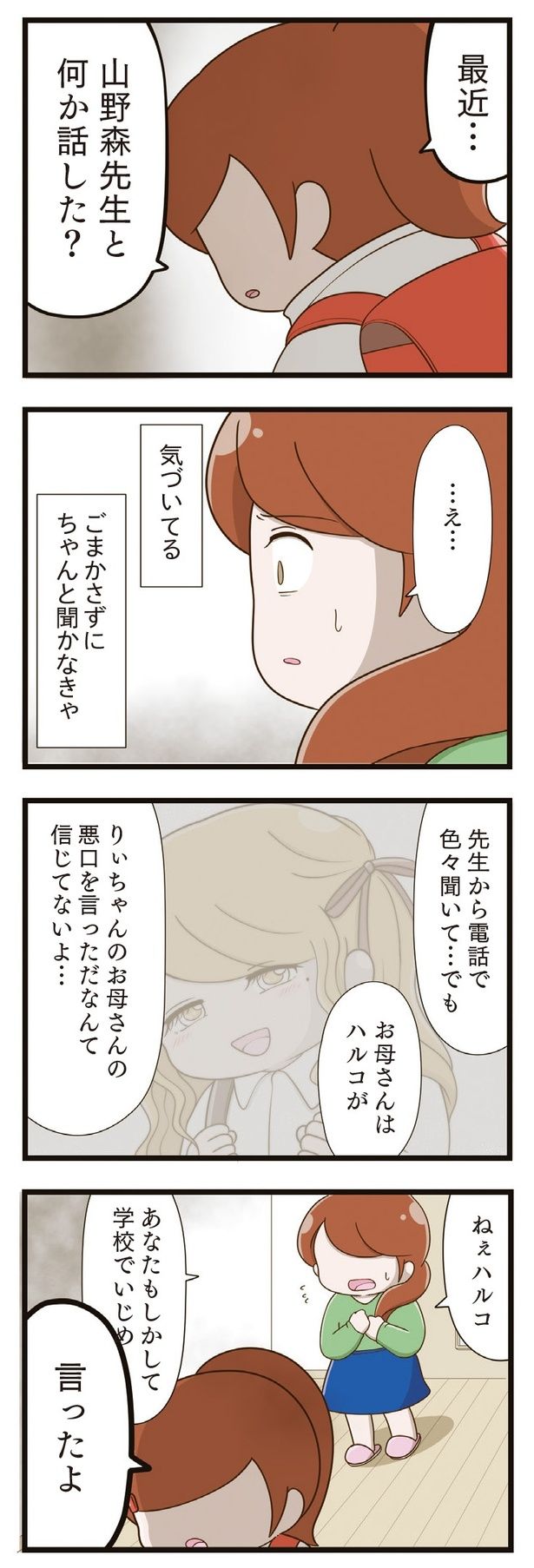 「お姉ちゃん学校でいじめられているんだって」息子の一言がきっかけで、母親は娘・ハルコの言動に違和感を抱くようになる。その結果分かったのは、ハルコが4年間、ひとりでいじめに耐えて隠し続けていたこと。いじめの本当の加害者は、被害者は誰? いじめと向き合う家族が希望を取り戻すまでの物語『家族全員でいじめと戦うということ。』を再連載でお届けします。いじめの原因になった同級生を描く新作『「お母さんの言うとおり」にしてきたのに 家族全員でいじめと戦うということ。 サキコの場合』も好評発売中です。