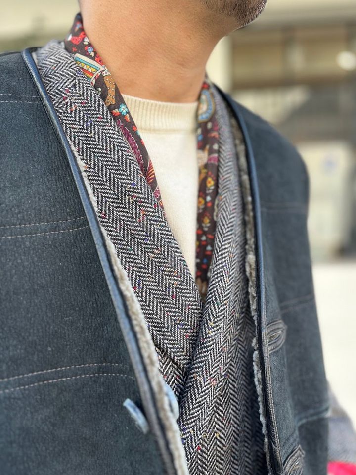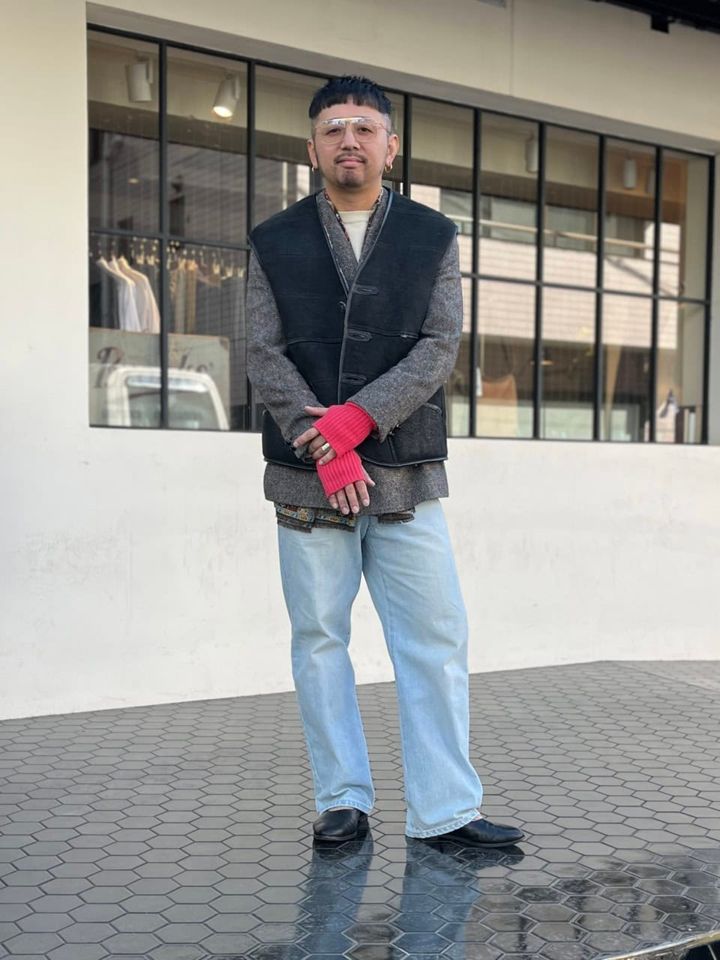 古着のベスト、J.プレスのジャケットとデニム、ヨネトミセンイのニット、サバージュのメガネ、トムウッドのピアス、ドレイクスのスカーフ、ジョシュアエリスのグローブ、デルモナコのシューズは黒野さん私物