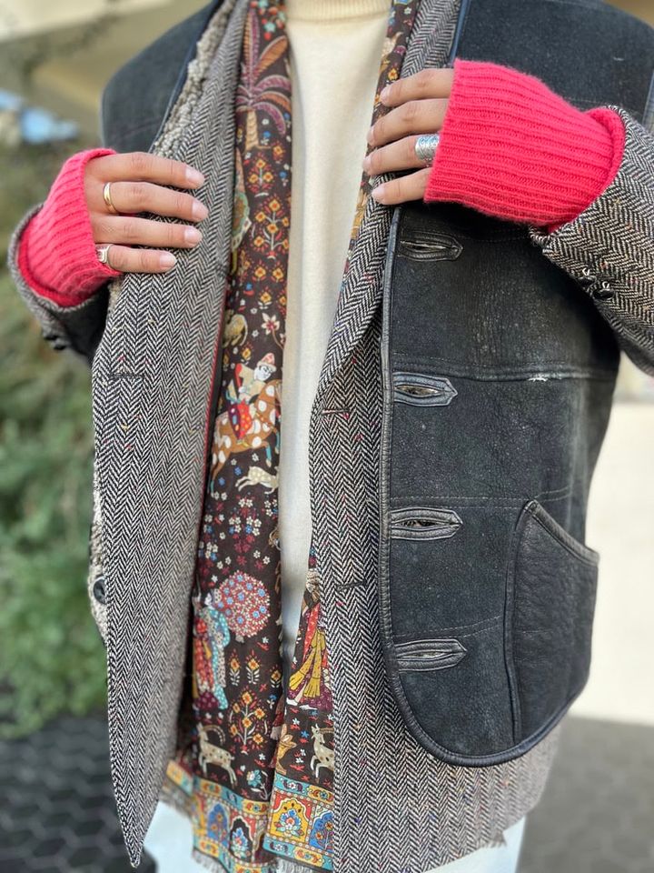 ストールは首から下げて、ジャケットの内側にセット。ジャケットとケンカしそうな柄でも、チラ見せ程度だとバランスよく仕上がるとか