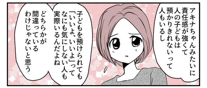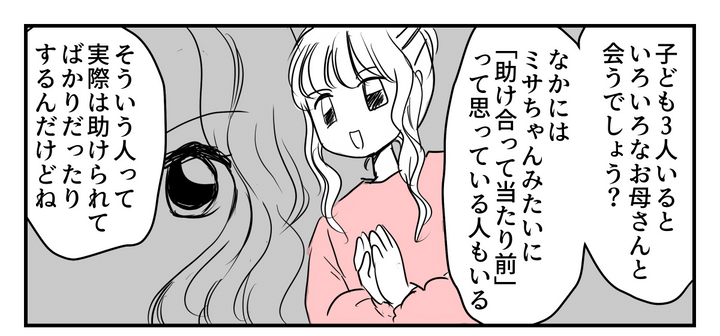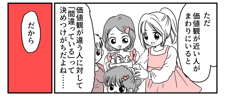 ママ友のなかにはミサちゃんみたいに「助け合って当たり前」と思っている人もいれば、私のように「自分のことは自分で」という人もいます。そのどちらも間違っているわけではないけれど、価値観が近い人がまわりにいるとどうしても自分たちと違う価値観の人を「間違い」だと決めつけがちですよね。